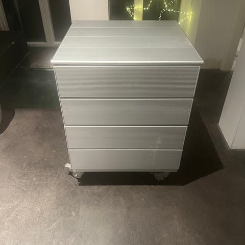 Kontormøbel med tre skuffer, lavet i træ og metal. Møblet er udstyret med hjul for nem mobilitet og har opbevaringsrum med adskilte sektioner i den øverste skuffe.