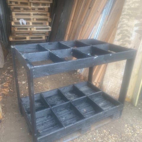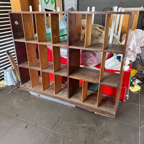 Reol i træ med hylder og hvide ben