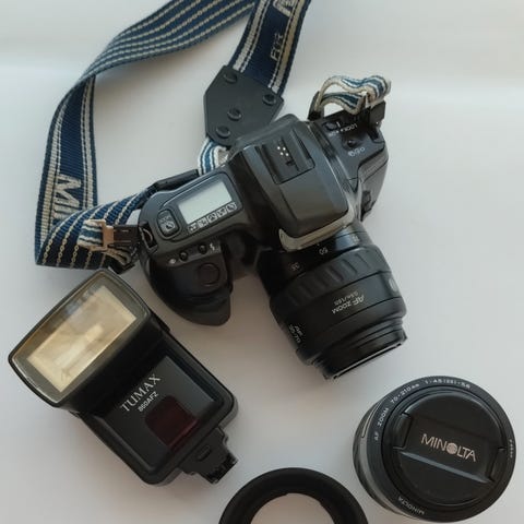 Minolta spejlreflekskamera med tilhørende objektiv, kamerataske i flere farver, Kodak film og diverse fotoudskrifter. Kameraet er egnet til fotografering med udskifteligt objektiv og opbevaring i den medfølgende taske.