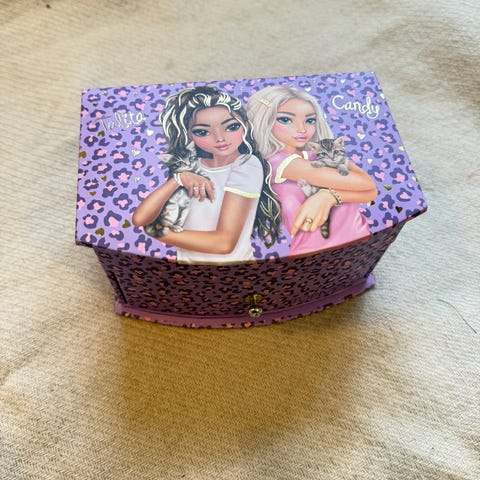 Super fint smykkeskrin fra Topmodel. Der er kodelås på smykkeskrinet, som spiller musik når det låses op. Er i pæn stand.