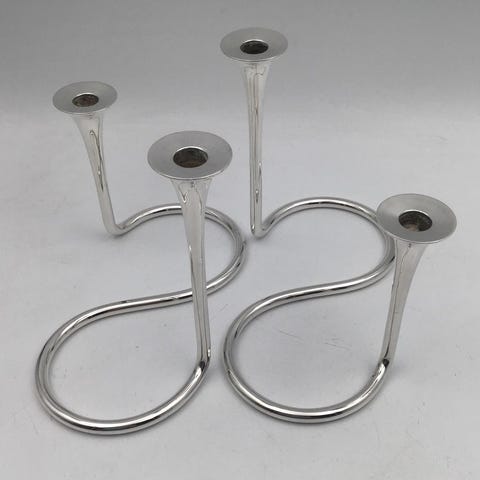 Michelsen. Sølv lysestage (925). Et par. Design Ibi Trier Mørch. Højde 16,5 cm. Længde 24 cm. Produceret 1953 (C9) + 1956 (F9)