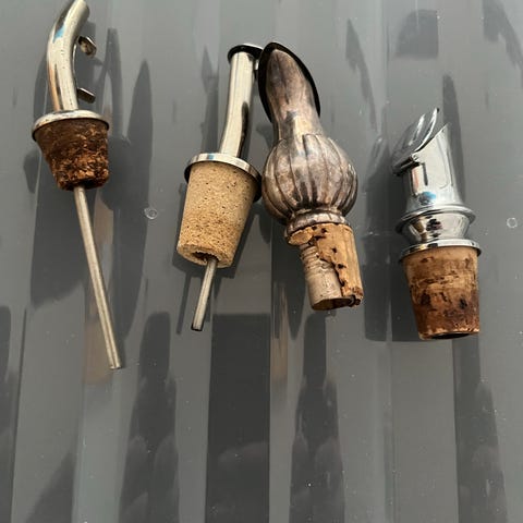 Antikke vin propper med top i metal og bund i kork. Propperne er designet til at forsegle flasker og bevare indholdets friskhed. Velegnet til brug ved forskellige højtider og lejligheder.