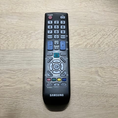 Samsung fjernbetjening i sort farve. Designet til brug med Samsung TV og understøtter standard funktioner som kanalvalg, lydstyrke og menu navigation.