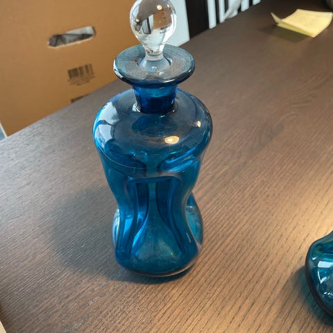 Holmegaard karaffel/klukflaske fremstillet i klart glas med rund prop. Designet til opbevaring og servering af drikkevarer.