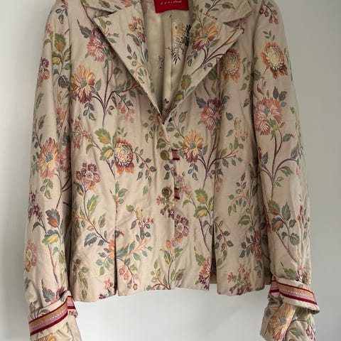 Fine mønster af blomster på tryklåse samt skrift “ three stars og 3 stjerner .skulle indikerer en jakke af god kvalitet og mærke .Jeg kan ikke finde den på Google så ved derfor intet om mærket .Så sælger jakken ud fra hvad lignende ville koste og ud fra detaljer og stand .Str s .Flot fest/fin hverdags jakke