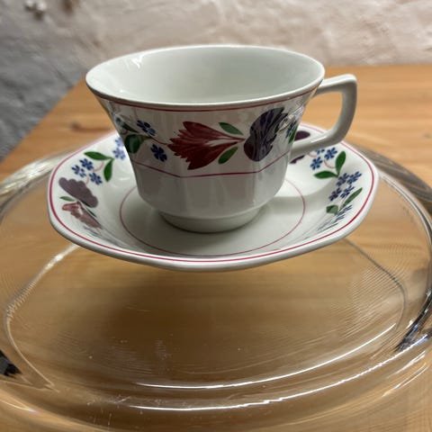 Tre komplette tekopper med underkopper i meget fin stand fra Adams Old Colonial. Du får tre ekstra underkopper med i hånden.