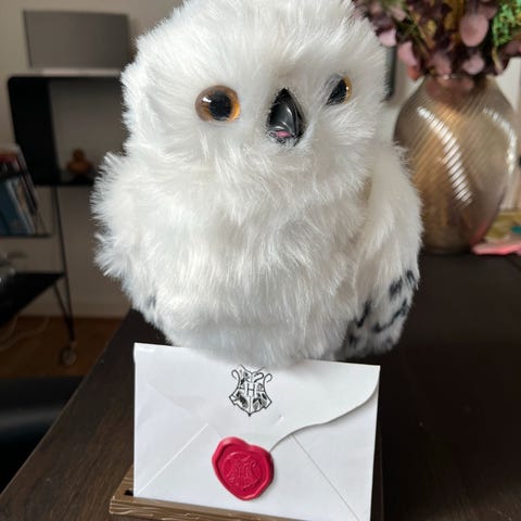 Interaktiv fortryllet Hedwig. Intakt med medfølgende brev og kam. Har over 15 forskellige lyde og bevægelser, stemmegenkendelse og bevægelsesdetektion.