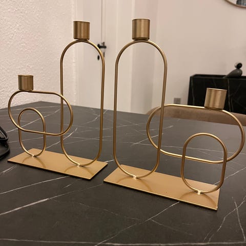 Jysk lysestage i metal med dobbelt ringe design. Lysestagen er velegnet til almindelige langelys og kan bruges som dekoration i hjemmet. Der medfølger 48 nye lys, sælges sammen