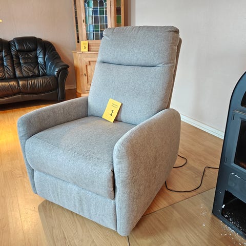 Grå lænestol, brugt med i god stand. Med elektronisk betjent trinløs vippefunktion og indbygget benstøtte. B78 x H111 x D97 cm