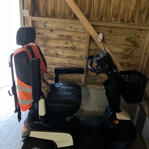 Justerbart styr. Sæde kan drejes til begge sider. Armlæn kan løftes. Justerbar hastighed. Trafik lys. Skriv evt med spørgsmål.