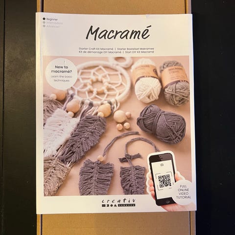 Macrame DIY Kit til juledekorationer med bomuldssnor. Indeholder materialer og instruktioner til at lave forskellige makramé julepynt.