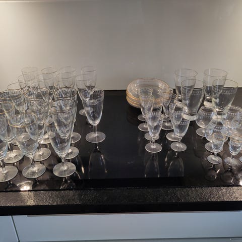 12 rødvin, 12 hvidvin, 12 portvin, 12 cocktail, 12 snaps, 10 øl. I alt 72 glas.