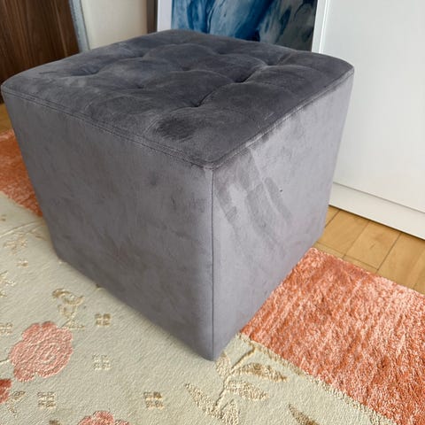 Sovepuf med gråt stofbetræk og en brun rektangulær pude. Sovepuf har et enkelt og funktionelt design, egnet til opholdsområder. Som ekstra gæste madras