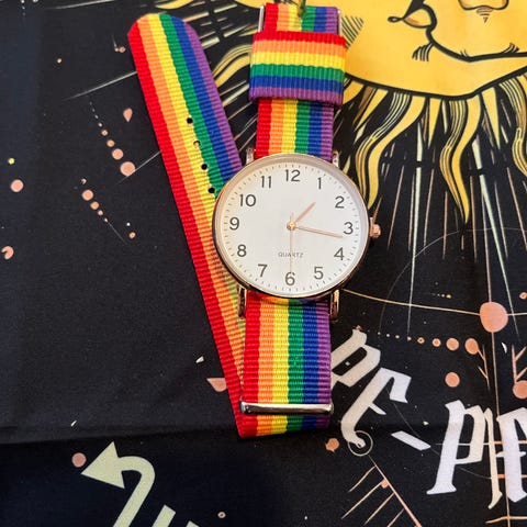 Kvinde Ur med regnbuefarvet rem og urskive med farverige tal.