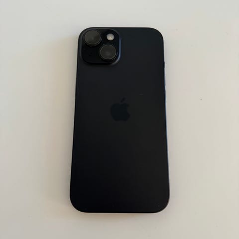 Sort Apple iPhone 15 med 128 GB lagerplads. Købt 31-Dec-2023. Fungerer som den skal.