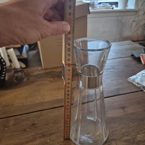 Rosendahl karaffel i klart glas med låg/prop med rustfri stål kant. Karaffelen har en slank, konisk form og kan bruges til servering af vand, vin eller andre drikkevarer.