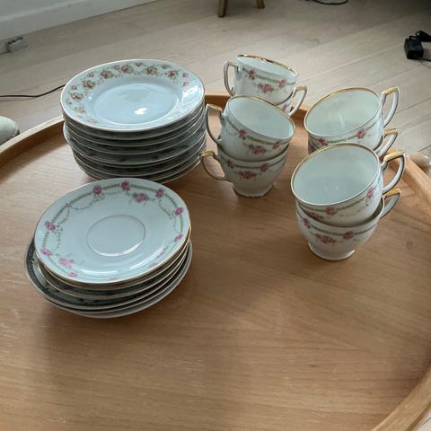 Kaffestel bestående af 11 kopper, 11 underkopper, 12 tallerkener, fløde/sukker, kaffekande og lille vase. Sælges samlet.