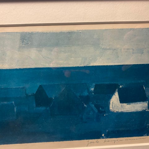 Værkerne viser abstrakte og stiliserede landskabsscener med brug af blå, grønne, gule og beige nuancer.