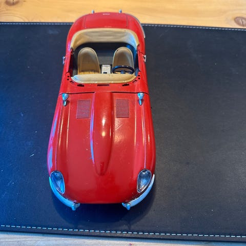 Jaguar modelbil i plastik med detaljeret design. Skala 1:18. Modellens farve er sølv med rød interiør. Samlerobjekt eller til dekoration.