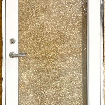 Facadedør i træ, 2 lags glas, 3 nøgler medfølger, venstrehængt indadgående.