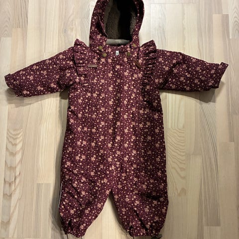 Lilla (mere mørk end på billederne) flyverdragt med fødder og luffer fra Fixoni. Str. 68.