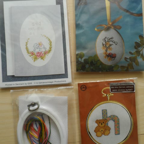 Fine små broderipakninger med alt til at brodere motiverne – se billederne. Alle broderierne bliver 13 x 18 cm.