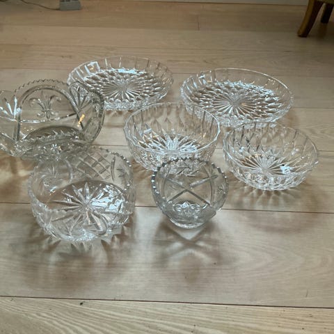 6 glas genstande. Skål ø 17 cm. Højde opsats 14. cm.