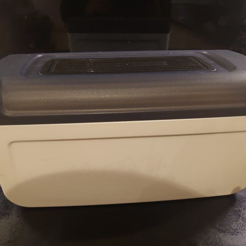 Der er 31cm lang og 24 cm bred og 8 cm dyb og er 12 cm høj når begge der er låge på