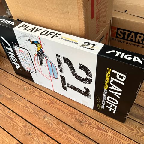 Sjovt og unikt ophæng lige til at hænge op på væggen. Er forventeligt tidligere blev brugt til ishockey undervisning eller lignende. Der står penalty shot bag på. Den er fremstillet i træ.