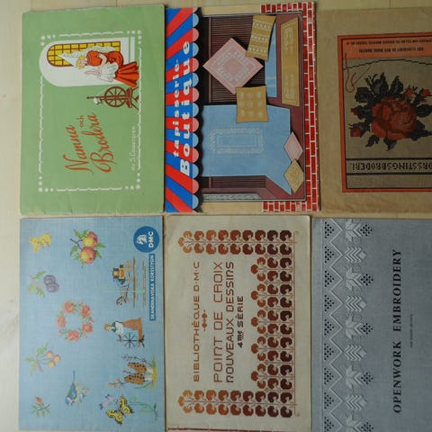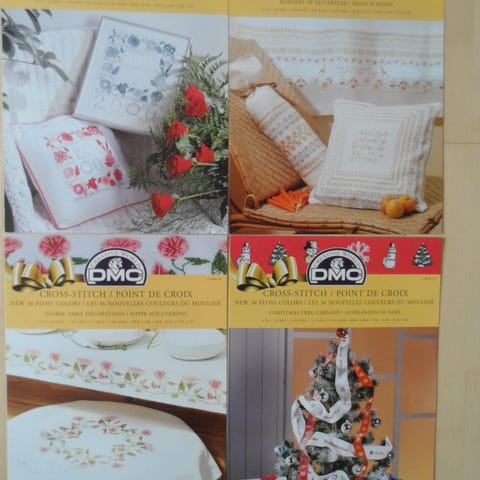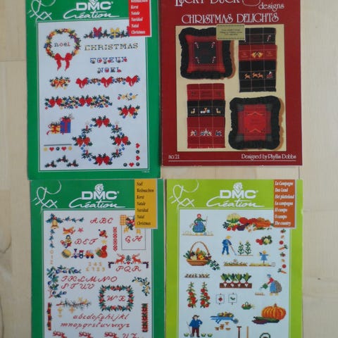 Dmc hæfter med broderimønstre. 3 hæfter, de to indeholder mønstre til de motiver der ses på forsiden, det sidste er et lidt større hæfte med flere mønstre – mest roser.
