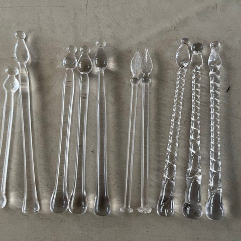 Rørepinde i glas og kork. Formentlig håndlavede, da hovederne varierer lidt i størrelsen. Cirka 20,5 cm.