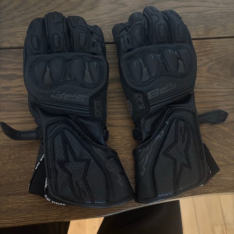 Alpinestars SP-8 handsker i størrelse L, sort farve, fremstillet af 74% ægte læder, 16% polyurethan, 10% syntetisk ruskind og foret med 100% polyester. Handskerne er designet til motorcykelbrug og har beskyttelsesfunktioner.
