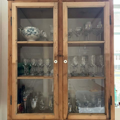 Skabet har en klassisk stil og kan bruges til opbevaring og fremvisning af forskellige genstande. H. 110 cm, l. 90,5 cm., B. 53 cm. Velegnet til brug i stue, køkken eller spisestue.