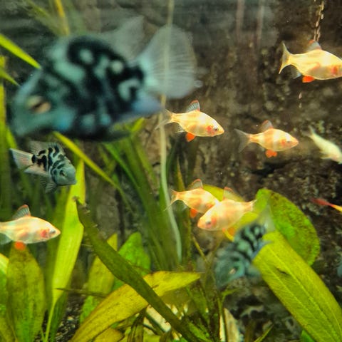 8 store T-barber foræres væk, da mit akvarie på 180 L er alt for lille til dem. Så er du den lykkelige ejer af et stort akvarie med masser af svømmeplads, kan du her få 8 store og aktive fisk (+ en lille rød barbe der altid har gået sammen med dem).