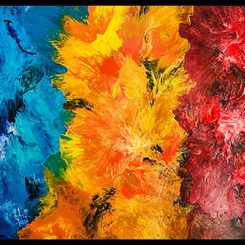 Kosmisk Resonans er et kraftfuldt abstrakt værk, hvor intense røde og gyldne nuancer smelter sammen med dybe sorte og blå toner i et energifyldt samspil. Dynamiske, cirkulære former og lagdelte teksturer leder tankerne hen på galakser, eksplosioner af lys eller organiske energifelter.