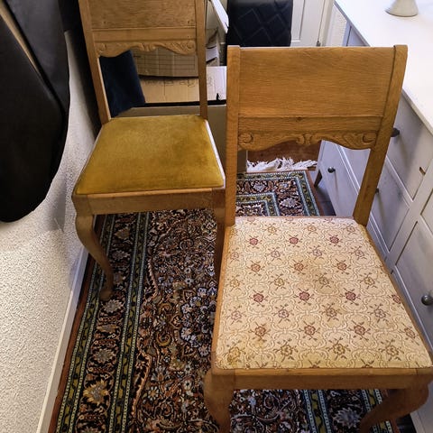 Har fem af disse ældre stole i træ. De er ret flotte, og træet er i fin stand, men stoffet er meget beskidt og de kunne bruge en ompolstring.
