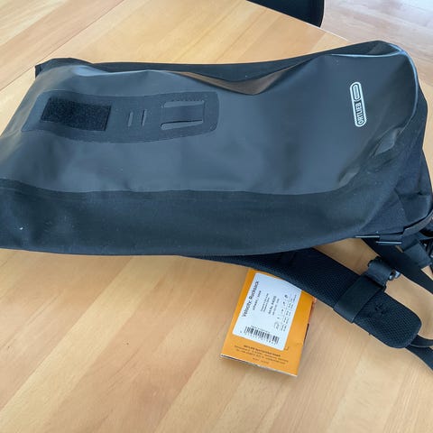 Den klassiske Velocity 23 fra Ortlieb i sort og gul. Det er en vandtæt rygsæk med et rumfang på 23 liter og en størrelse på 50x30x16 cm. Vægten er 880 gram.