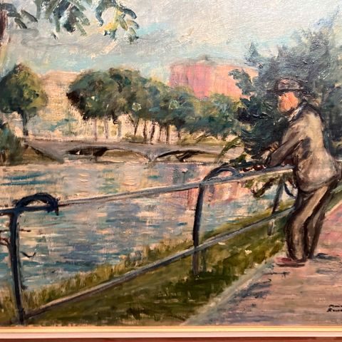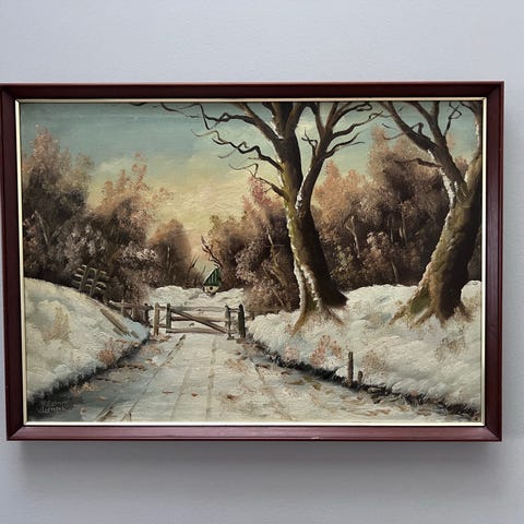 Olie på lærred maleri med motiv af vinterlandskab. Maleriet viser sneklædte områder med huse og træer, udført i en realistisk stil med tydelig penselstrøg. Indrammet i en klassisk ramme.