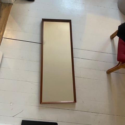 Smukt vintage spejl (figurspejl / gulvspejl) med bred teakramme. Ren 70’er/ 80’er vibe. Det har lidt anløb på spejlfladen, som er svært at få med på billedet. Derfor skarp pris. Det har hængt på et søm (direkte i et hul i rammen) men jeg monterer gerne to små øskner hvis du hellere vil have den på snor. Jeg kan muligvis hjælpe med transport i Københavnsområdet mod betaling. SE OGSÅ MINE ANDRE ANNONCER