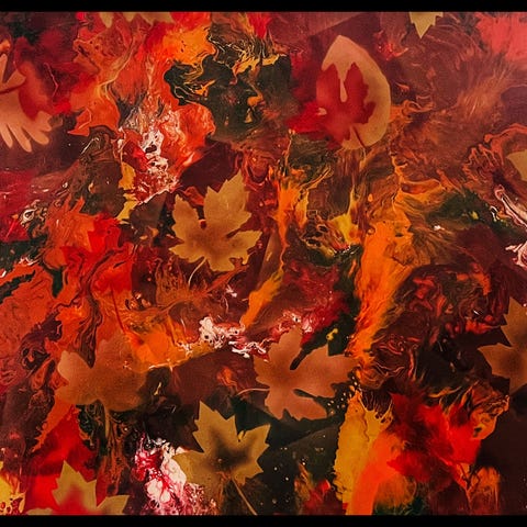 "Efterår 2" er et akryl-/oliemaleri på lærred, monteret i en sort svæveramme. Med sine varme nuancer af rød, orange, gylden og grøn gengiver værket efterårets stemning gennem et spil af blade og abstrakte former. Maleriet måler 80 x 100 cm og er en del af en serie på i alt tre værker i forskellige størrelser, der tilsammen fortolker årstidens farverige forfald og naturlige skønhed.