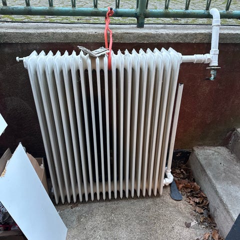 2 Gammle støbejerns radiatore med flere sektioner, velegnet til opvarmning af rum. Radiatoren er hvidmalet og har en klassisk design.