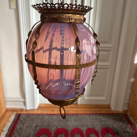 Antik Glas Ampel med fine slibninger monteret til el. Den er 50 cm i højden.