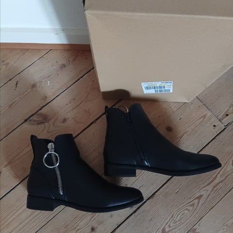 ONLY støvler i størrelse 39, sort farve. Støvlerne har lynlås og lav hæl. Læder, de fremstår som klassiske sorte støvler med en slidstærk gummisål.