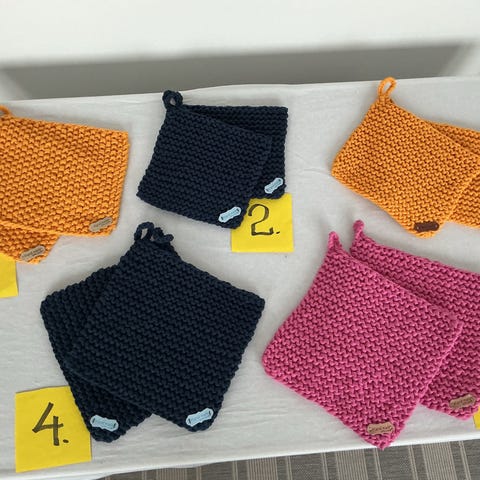 Et par hæklede grydelapper i tyk kvalitet, så man undgår at brænde sig igennem.
