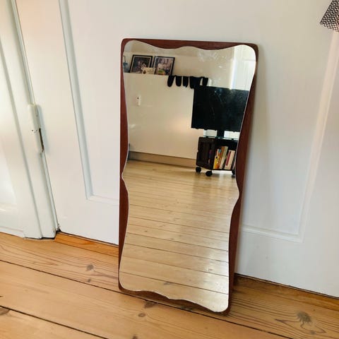 Smukt retro / vintage midcentury spejl med teakramme. 74 x 42. Lige nu har det krog på den brede led, men man kan bare skifte den til den anden led så den hænger lodret. Jeg kan muligvis hjælpe med transport i Københavnsområdet mod betaling. SE OGSÅ MINE ANDRE ANNINCER