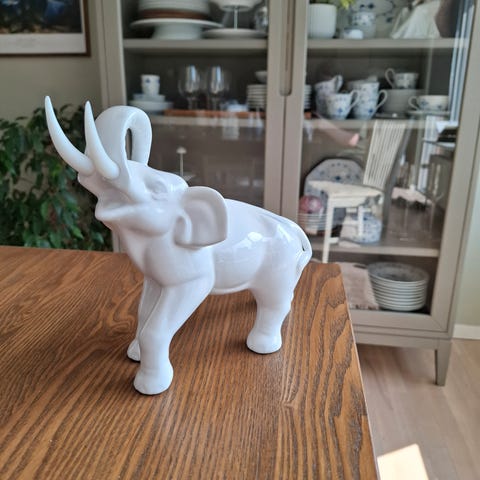 Figuren har detaljeret udformning med løftet snabel og er egnet til dekoration.