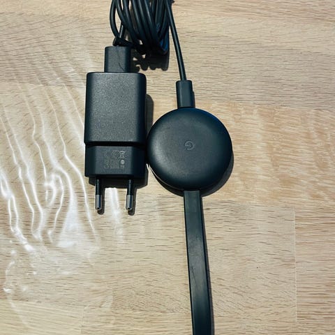 Google Chromecast streaming-enhed med tilhørende oplader og kabel. Enheden bruges til at streame indhold til fjernsyn via Wi-Fi-forbindelse.