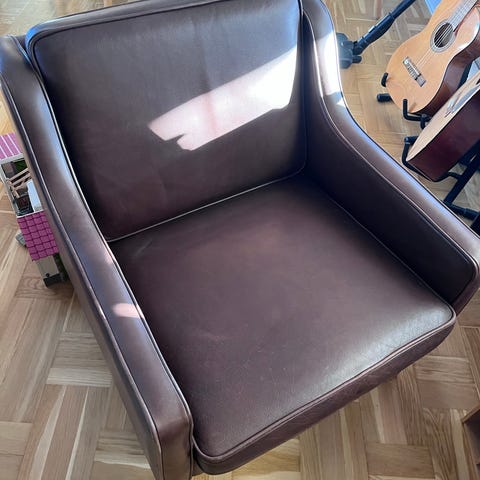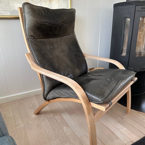 Fine Mogens Hansen lænestole der er brugt meget sparsomt. Ser ud som nye og har stort set kun stået til pynt. Betrukket med sort læder og stel af bøg. Træet kan gøres lysere ved en simpel sæbebehandling.