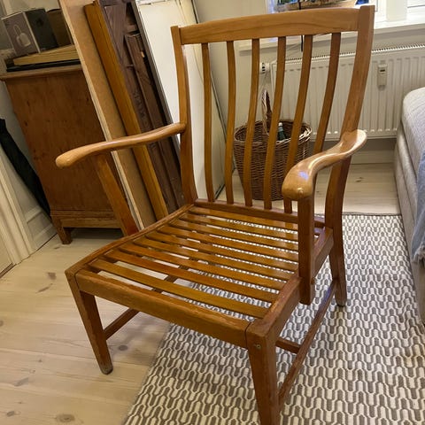 Skøn og charmerende stol med mange flotte detaljer. Jeg købte den i Røde Kors i Taastrup da Badehotellets produktion var lukket efter 10. sæson og rekvisitter og møbler blev sat til salg der. Har desværre ikke plads til den længere og synes den fortjener en æresplads et sted.