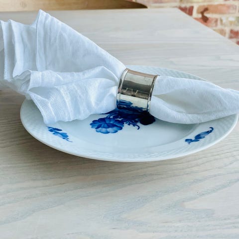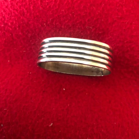 Servietring i sølv. Vejer18 g. Der er indgraveret bogstaver. Den med vindruesklaser er solgt.